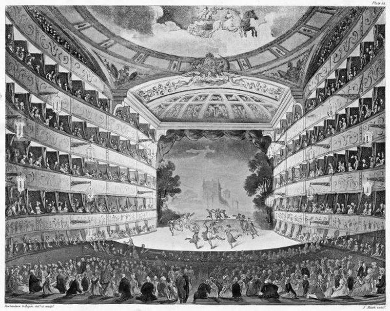 Зрительный зал Королевского театра на Хеймаркет в Лондоне, где в эпоху Регентства шли итальянские оперы, а в освещенных наравне со сценой ложах – свои мини-спектакли