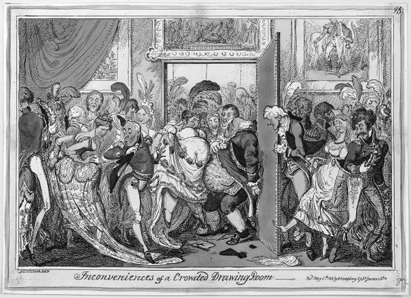 На карикатуре 1818 года Джордж Крукшенк высмеял неимоверную толчею на все более редких приемах у королевы Шарлотты