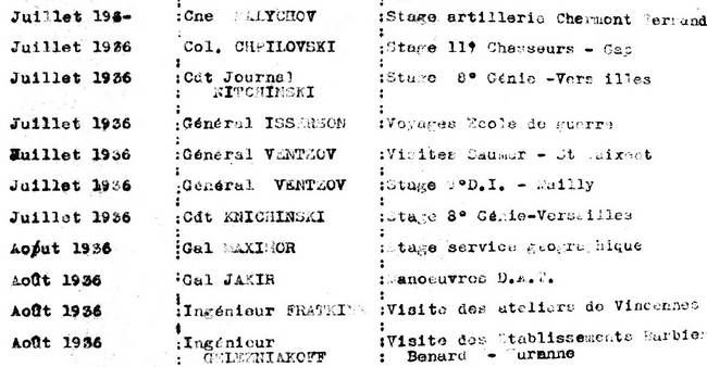 Один из списков советских офицеров на стажировке во Франции в июле – августе 1936 г. (SHD)