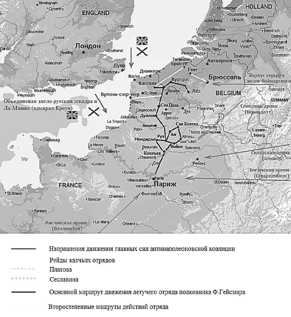 1 февраля 1814 года[11] в Брюсселе полковник Гейсмар получил приказ со своим летучим отрядом выйти во французский тыл и «угрожать левому флангу Северной армии Франции, обойти крепости, нарушить коммуникации генерала Мезона[12], посеять панику и беспокойство в департаментах и соединиться с армией Блюхера».