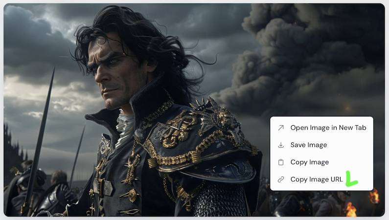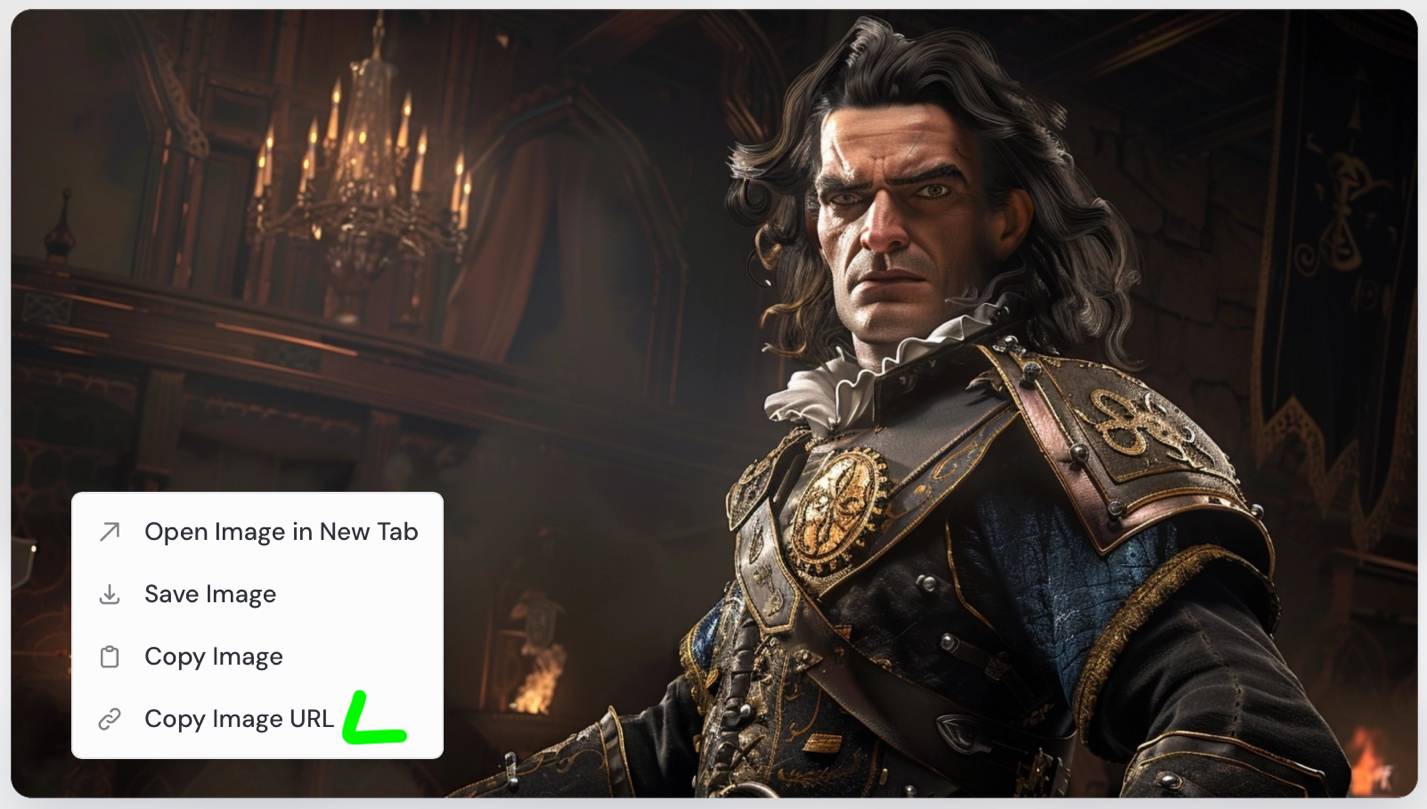 Чтобы Midjourney использовал выбранное изображение как эталон, нужно получить на него ссылку и вставить её в команду –cref.