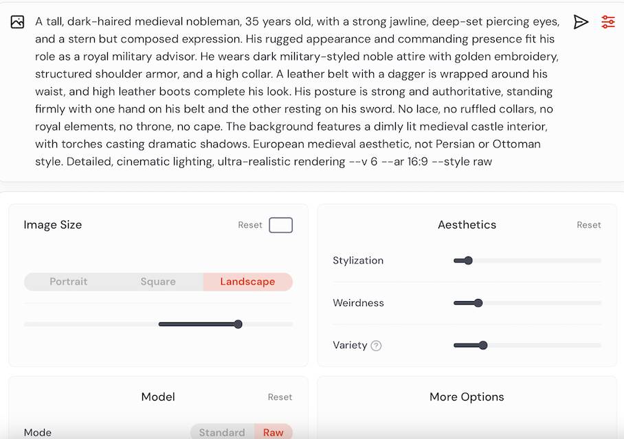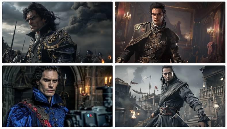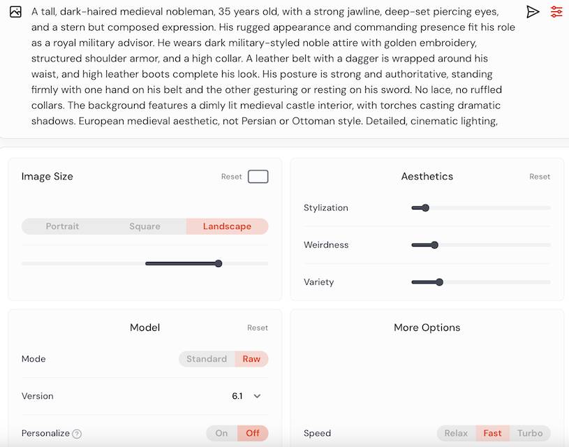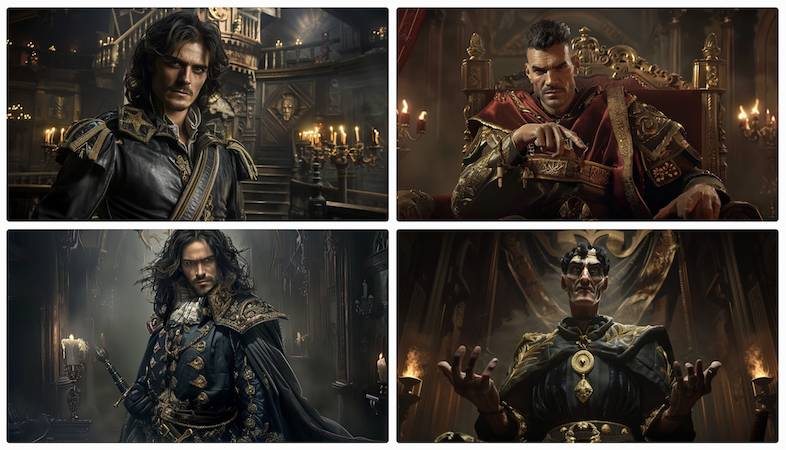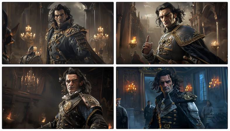 Этот вариант уже максимально приближен к задуманному образу. Александр выглядит уверенно, его черты лица стали более выразительными, а общий стиль одежды теперь соответствует образу военного советника. Позы стали лучше передавать его авторитет, а фон подчёркивает атмосферу средневекового замка.