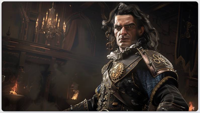 Высокий, темноволосый дворянин средневековой эпохи, 35 лет, с выразительными чертами лица, глубоко посаженными пронзительными глазами и строгим, но уравновешенным выражением. Его суровый вид и уверенная осанка соответствуют его роли королевского военного советника.