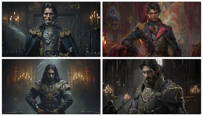 Нижний правый вариант ушёл в стилистику тёмного антагониста – слишком резкие черты лица, мрачная одежда, театральная поза.