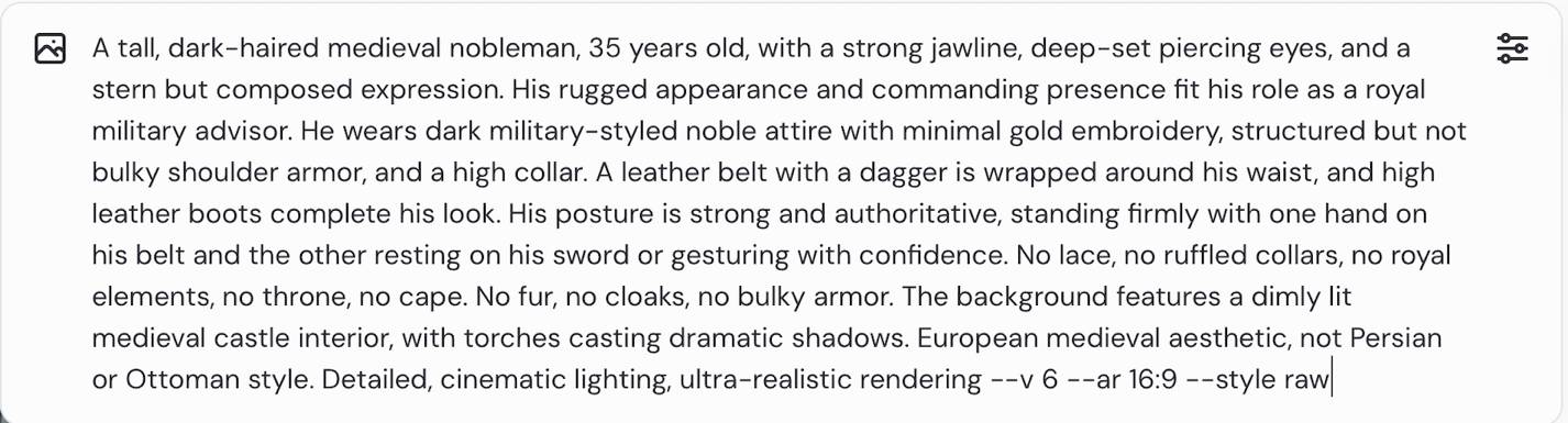A tall, dark-haired medieval nobleman, 35 years old, with a strong jawline, deep-set piercing eyes, and a stern but composed expression. His rugged appearance and commanding presence fit his role as a royal military advisor. He wears dark military-styled noble attire with minimal gold embroidery, structured but not bulky shoulder armor, and a high collar. A leather belt with a dagger is wrapped around his waist, and high leather boots complete his look. His posture is strong and authoritative, standing firmly with one hand on his belt and the other resting on his sword or gesturing with confidence. No lace, no ruffled collars, no royal elements, no throne, no cape. No excessive gold decorations, no 18th-century elements, no naval themes. The background features a dimly lit medieval castle interior, with torches casting dramatic shadows. European medieval aesthetic, not Persian or Ottoman style. Detailed, cinematic lighting, ultra-realistic rendering –v 6 –ar 16:9 –style raw –cref https://cdn.midjourney.com/fc28cb87-9e4f-4ea3-98c3-a1df24417baf/0_0.png –cw 80