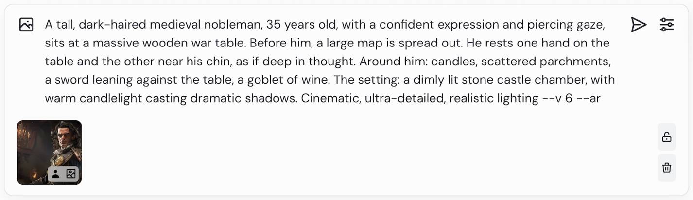 A tall, dark-haired medieval nobleman, 35 years old, with a confident expression and piercing gaze, sits at a massive wooden war table. Before him, a large map is spread out. He rests one hand on the table and the other near his chin, as if deep in thought. Around him: candles, scattered parchments, a sword leaning against the table, a goblet of wine. The setting: a dimly lit stone castle chamber, with warm candlelight casting dramatic shadows. Cinematic, ultra-detailed, realistic lighting –v 6 –ar 16:9 –style raw –cref https://cdn.midjourney.com/b102aa89-eb5a-44a9-91cd-d5e561f33e78/0_2.png –cw 80