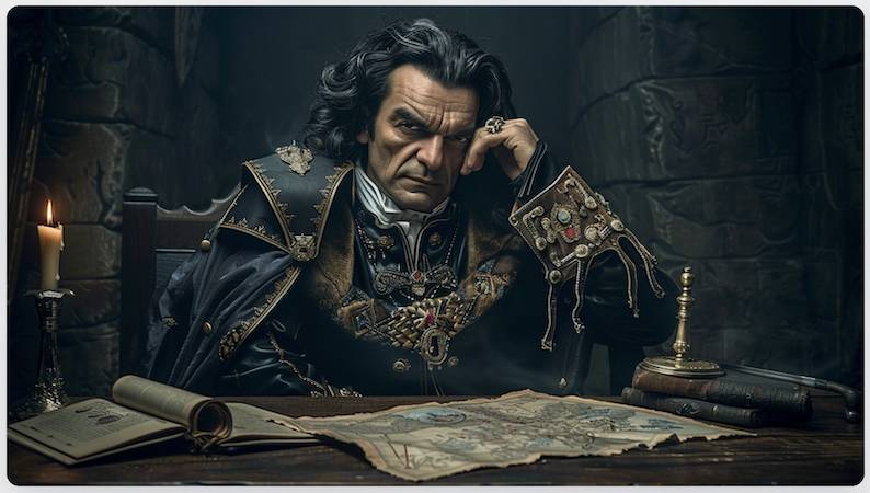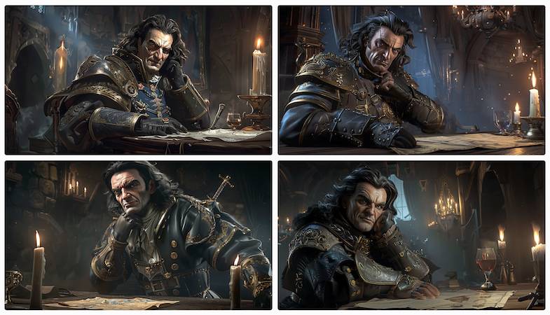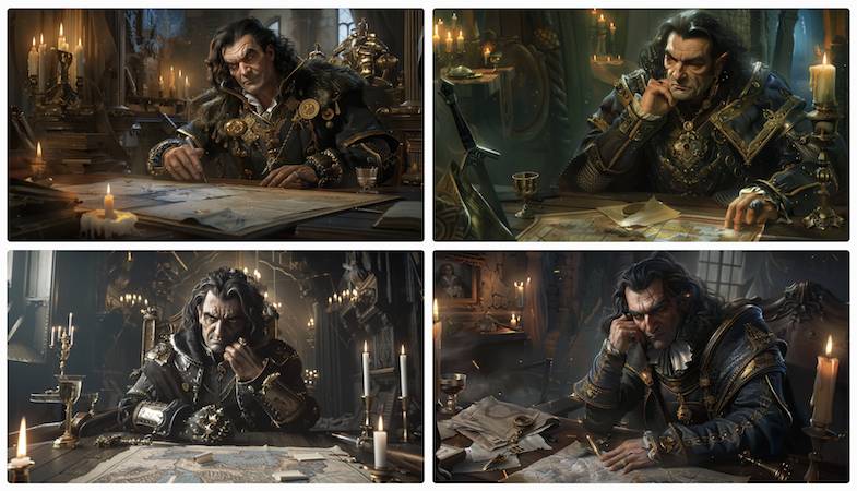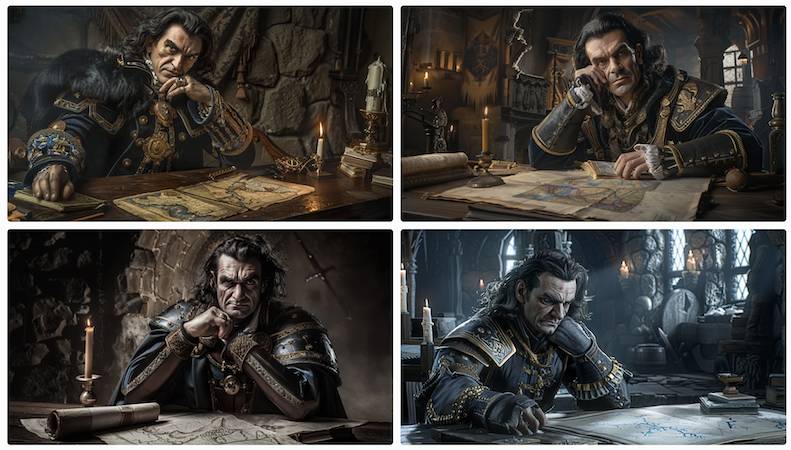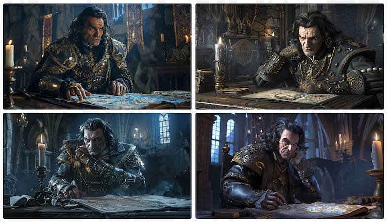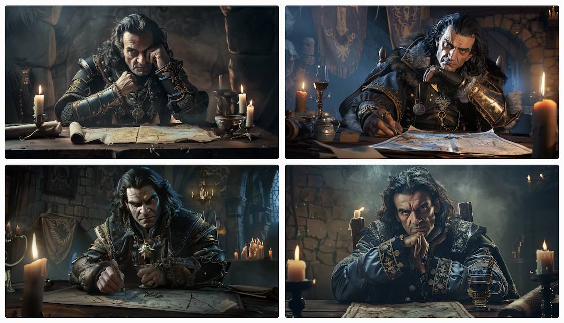 Александр, высокий темноволосый дворянин средневековой эпохи, 35 лет, сидит за массивным деревянным военным столом. Перед ним разложена карта, он держит одну руку на столе, другую – у подбородка, внимательно изучая стратегический план. Его выражение серьёзное, но без излишнего драматизма. Вокруг него свечи, свитки, перья для письма, бокал вина, а рядом на столе лежит меч.