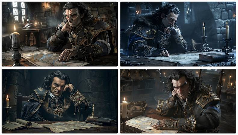 В комнате минимальное количество деталей – только свечи, карта, несколько свитков и кубок вина. Нет лишних предметов, королевской атрибутики или чрезмерных украшений. Фон – каменный зал средневекового замка, освещённый свечами.