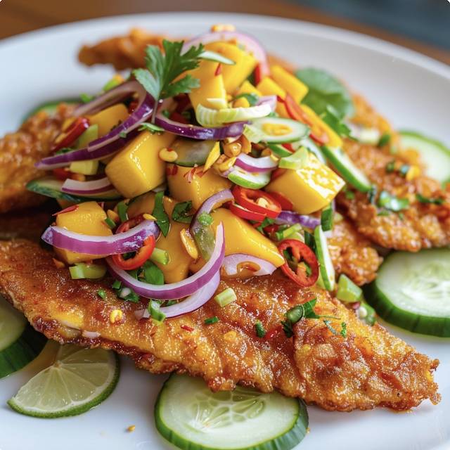 Подача: На большие тарелки выложите хрустящий сом и сверху равномерно распределите салат из манго.