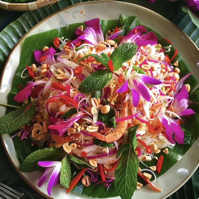Пла Дук Фу – это популярное тайское блюдо, которое сочетает в себе хрустящего жареного сома с освежающим салатом из манго. Сом жарится до золотистой хрустящей корочки, а затем подается с острым и сладким салатом из свежего манго, мелко нарезанного красного лука, огурца и чили, заправленного лаймовым соком и рыбным соусом.