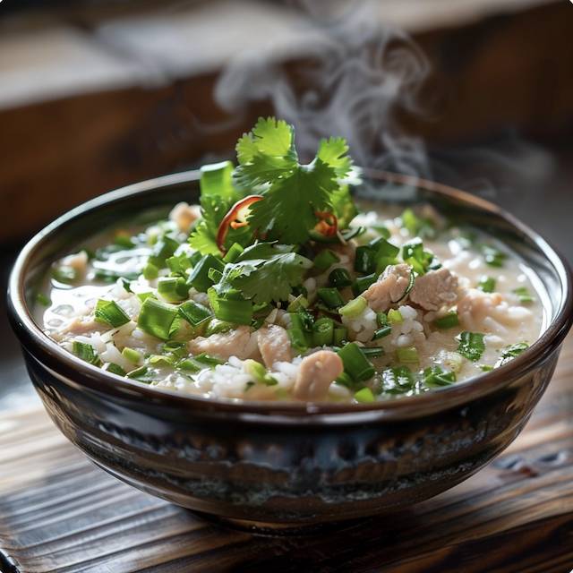 Као Том – это традиционный тайский рисовый суп, который обычно подают на завтрак или в качестве легкой закуски в течение дня. Это сытное блюдо сочетает в себе мягкий вкус вареного риса с богатым бульоном и различными добавками, такими как морепродукты, курица или свинина, а также травы и специи, придающие ему особенный аромат.