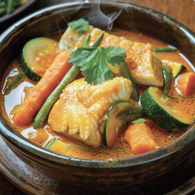 Подача: Разлейте готовый карри по тарелкам, убедитесь, что овощи и рыба равномерно распределены.