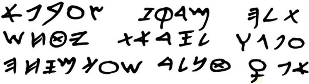 Под тремя строчками символов, которые отдаленно смахивали на греческий алфавит, стоял немногословный комментарий автора сайта: «Так выглядела финикийская надпись, высеченная на Бразильском камне почти за две тысячи лет до того, как моряки Колумба высадились на берег Америки». Но вовсе не присутствие семитской надписи на Бразильском камне шокировало Влада и Адриано. Среди незамысловатых крючков, «гребешков» и окружностей они увидели символ женского начала!