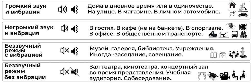 Не забывайте переводить телефон в режим «вибрации» или «без звука», в ситуациях, где звук входящего вызова помешает окружающим. В особых случаях его нужно переводить в режим «не беспокоить».