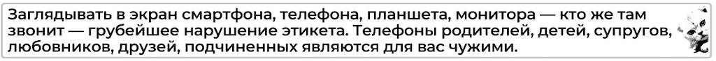 Насколько мешает смартфон за столом переговоров или на совещании, вопрос дискуссионный. Все зависит от ситуации. На переговорах высокого уровня даже само наличие гаджетов у переговорщиков может быть неуместным. На демократичных мероприятиях участники могут ковыряться в смартфоне во время совещания, и это никого не будет смущать.