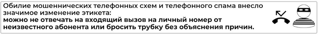 Разгул телефонного мошенничества и навязчивые технологии «холодных звонков» изменили правила телефонного этикета. Сегодня не взять трубку с незнакомого номера не считается нарушением этикета. Если кому-то нужно с вами связаться, есть другие доступные способы коммуникации.