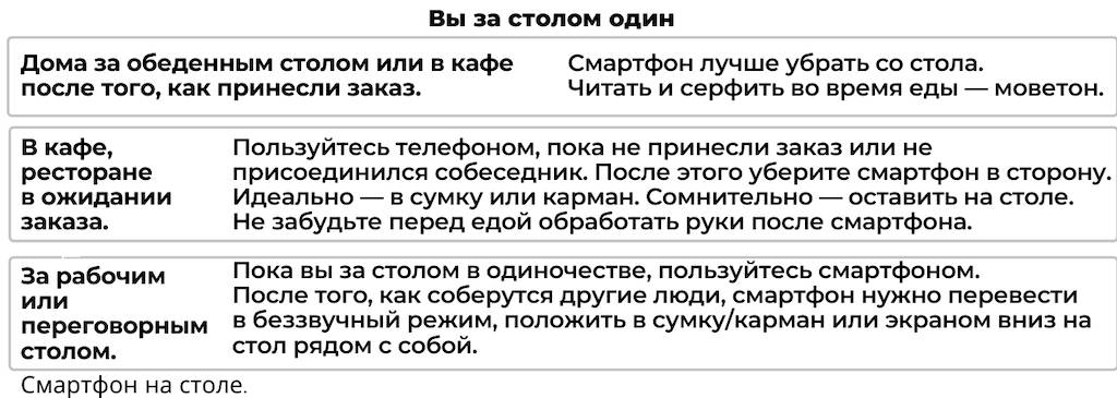 Все встреченные мной рекомендации по телефонному этикету предостерегают класть смартфон на стол. Однако люди это делают и, скорее всего, будут делать и впредь. Потому что это удобно.