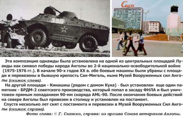 В ознаменование победы над агрессором и его марионетками, на площади имени 1 Мая был сооружен монумент: в последней смертельной схватке, словно два бойца, застыли два бронетранспортера: БРДМ-2 ФАПЛА советского производства и заирский БТР войск ФНЛА AML-90 «Panhard», участвовавший в битве при Кифангондо (23 октября-10 ноября 1975 г.). Символичным было то, что броневик советского производства (БРДМ-2) подмял под себя заирский «Панар»24.