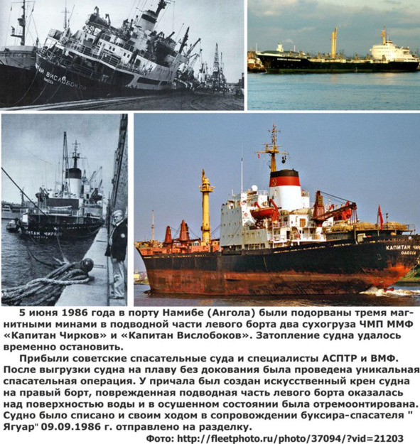 В 3.00—3.40 30 июля 1984 г. в результате диверсии были подорваны два судна, стоявшие на внутреннем рейде порта Луанды. Одно из судов принадлежит ГДР, другое – Анголе. На борту ангольского судна (со смешанным анголо-кубинским экипажем), прибывшего из Бразилии, находился груз продовольствия и снаряжения для ФАПЛА. На судне ГДР – груз для СВАПО (28 автомашин, продовольствие), а также промышленные товары для НРА.