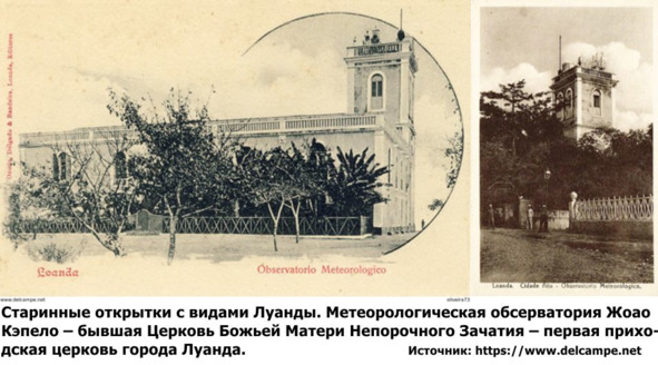 Строительство Церкви Божьей Матери Непорочного Зачатия (Igreja de Nossa Senhora da Conceição) началось в 1583 году. Это был первый приход в городе Луанда. Основу здания первой церкви составили деревянные столбы, стены – гипс, грязь, реечные материалы, а крыша была из тростника в ладонь толщиной. В 1653 году началась работа по строительству более прочного здания, которая завершилась в 1668 г. В дальнейшем из-за отсутствия должного технического обслуживания с 1818 по 1828 г. службы в церкви не проводились. Здание ветшало и в 1881 г. тогдашний губернатор в ее башне разместил Метеорологическую обсерваторию Жоао Кэпело.