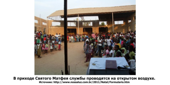 Есть в Анголе приходы, где основательные здания храмов еще не построены, но имеются помещения для осуществления месс и других религиозных обрядов. Во многих из них службы проводятся на открытом воздухе, как например, в приходской общине святого Матфея и Евангелиста. Настоятель прихода Раймундо Ансельмо Родригес младший (Padre Raimundo Anselmo Rodrigues Júnior), имеющий 12—летний опыт служения в различных епархиях, даже создал сайт, с помощью которого обратился к пастве за помощью в строительстве храма.
