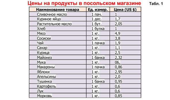 Мы как-то примерно подсчитали, во что обходилась потребительская корзина семье из 4-х чел. (по самым скромным подсчетам (US $). Причем в этот список не вошли другие продукты, которые мы ежемесячно покупали.