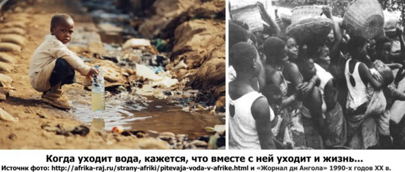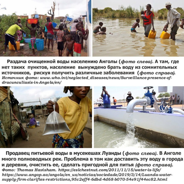 В период отсутствия воды вспышек заболеваний было нисколько не меньше, чем в период дождей. Во время ливней грязевые потоки забивали водопроводные системы всякими нечистотами. Ангольцы брали воду из любых, самых сомнительных источников, где можно было найти дизентерию, малярию, холеру.
