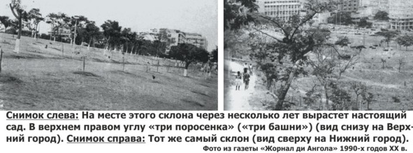 Один из них когда-то существовал на склоне горы, рядом с которой стояло наше Торгпредство. На фотографии, взятой из газеты «Жорнал ди Ангола», хорошо видны на переднем плане посадки молодых деревьев. Это те, которые португальцы (руками местных жителей) высадили здесь в последние годы своего пребывания. Большинству деревьев лет 5—8. От многих из них остались только одни воспоминания – там, где их вырвали с корнями (спрашивается, зачем?!), остались только лунки, другим повезло – им сохранили жизнь, но когда выжившие по-настоящему зашелестят листвой, пройдет не один год. Непонятно только, кому и для каких целей понадобились эти «дети» деревьев? На дрова не годятся. Может быть для удилищ? Тоже вряд ли!