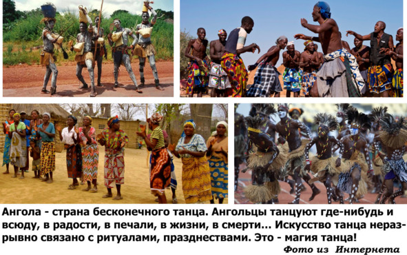 «Ангольцы – танцующая нация» – это определение в полной мере подходит для населения этой страны. Неважно, о каком танце будет вестись речь: будь то «народный», «классический» или «современный», в каждом из них будет звучать особый, неповторимый ритм Африки. Здесь танцуют повсюду: в дансинг-клубах, на улицах, во время карнавалов. И даже во время католической литургии. Танцуют все! И стар, и млад…