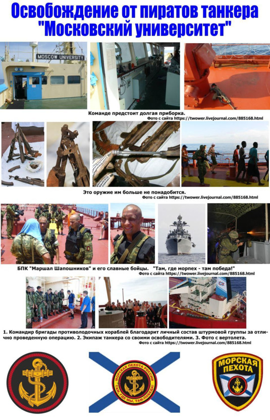 А вот что рассказал командир 1-й группы захвата морской пехоты Тихоокеанского флота, находящийся в тот момент на борту «Маршала Шапошникова» и участвовавший в операции по освобождению танкера «Московский университет» из пиратского плена, подполковник Андрей Ежов: