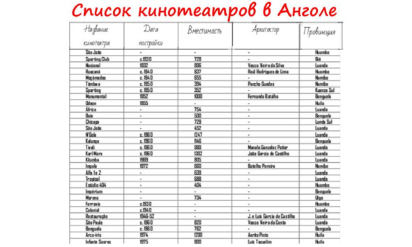 Самые впечатляющие кинотеатры были построены еще при португальцах – между 1950-ми и 70-ми годами. Многие из них пришли в упадок. Разбросанные по всей Анголе, они говорили о культуре нации лишь в прошедшем времени. Вот почему в Анголе после гражданской войны появился проект Гёте-Института по прославлению и сохранению культурного наследия Анголы, восстановлению ее самобытности.