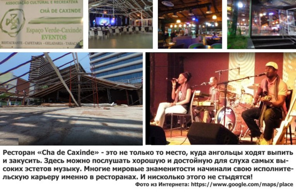 А если соединить два (три или более) искусства: кулинарию с музыкой, театром, кино – в одно? Получится ресторан «Cha de Caxinde», расположенный в Луанде, неподалеку от площади Лумьежи (Largo Lumeji), на ул. 1-го съезда МПЛА.