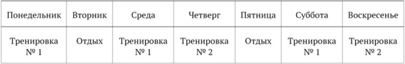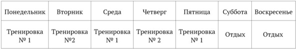 Также возможны другие варианты, при которых сохраняется принцип» не ставить основную тренировку два дня подряд и соотношение 3 основных тренировки и две дополнительных. Например: