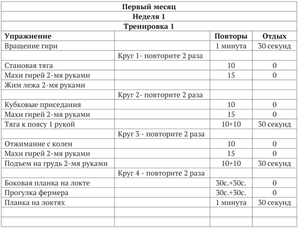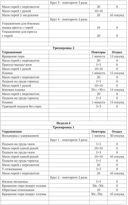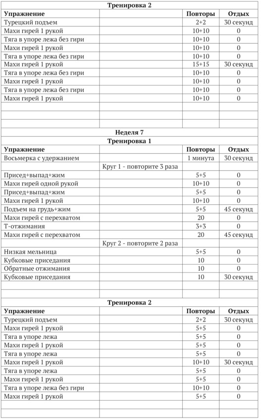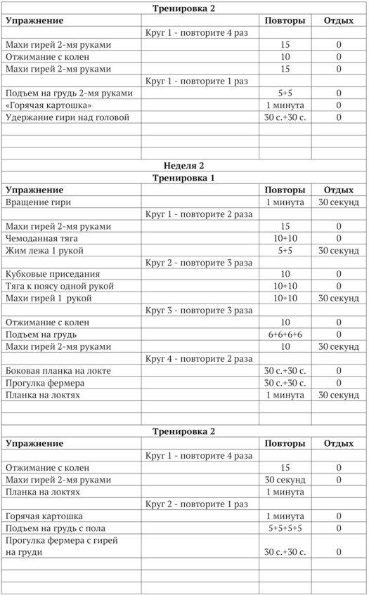 Тренироваться с гирями нужно 5 раз в неделю. Три тренировки будут основные, они длятся 30—40 минут, называются «Тренировка №1» и две тренировки дополнительные, которые называются «Тренировка №2». 1. Количество тренировок в неделю.
