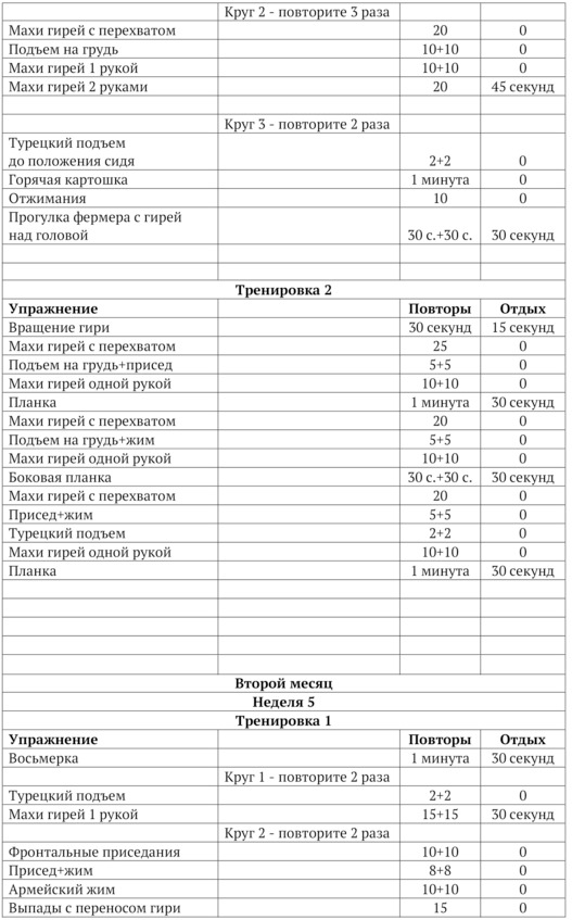 Психологами доказано, чтобы занятия фитнесом перешли в навык, для этого нужно заниматься фитнесом в течение одного месяца, а чтобы этот положительный навык закрепить, нужен еще один месяц. И поэтому программа тренировок: «Фитнес с гирями» предусмотрена на два месяца. Пройдите эту программу, и у Вас появится навык заниматься фитнесом, и Вы каждый месяц должны повторять все упражнения второго месяца программы тренировок «Фитнес с гирями». Таким образом, эта программа позволит вам постепенно перейти к здоровому образу жизни. 5. Длительность программы тренировок: «Фитнес с гирями».