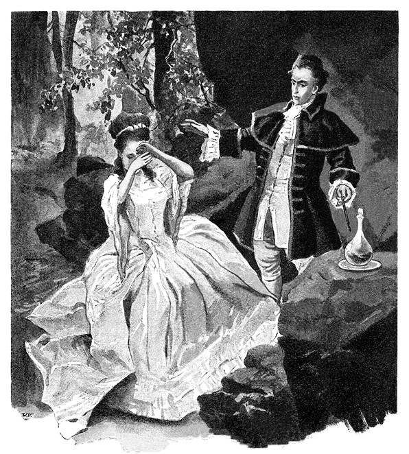 Бальзамо взял графин, все так же стоявший в золотой чаше, отнес его в самое темное место у задней стенки беседки, где из искусно обтесанных обломков скал был сложен грот. Затем, взяв эрцгерцогиню за руку, подвел ее к мрачному входу в грот.