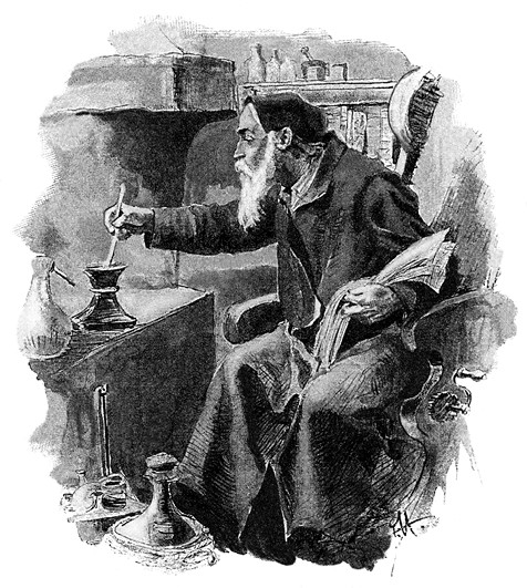 Когда путешественник вошел, старик, быстро и ловко подкатив свое кресло к печи, с тщательностью, достойной уважения, принялся снимать пену с кипящей в тигле жидкости. Когда появление спутника отвлекло старика от этого занятия, он правой рукой нахлобучил на уши бархатный, когда-то черный колпак, из-под которого торчали кое-где пряди редких серебристых волос, и с необычным проворством вытащил из-под колесика кресла полу своего длинного шелкового, подбитого ватой халата, который после десятилетней носки превратился в бесцветную, бесформенную и кое-где рваную тряпку.