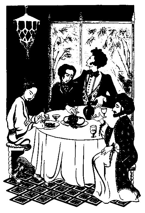 Павильон, уютный, как будуар, и выстроенный в самом изысканном стиле, был разделен на множество небольших помещений ажурными перегородками из бамбуковых решеток тонкого и разнообразного рисунка, перемежающихся с разноцветными стеклышками; вдоль стен шли широкие диваны; его освещали бумажные фонарики, причудливо и фантастически расписанные. В глубине самого большого отделения возвышалась эстрада, служившая подмостками рангунам, если богатым посетителям Меестер Корнелиса хотелось приправить свой ужин любопытным зрелищем.