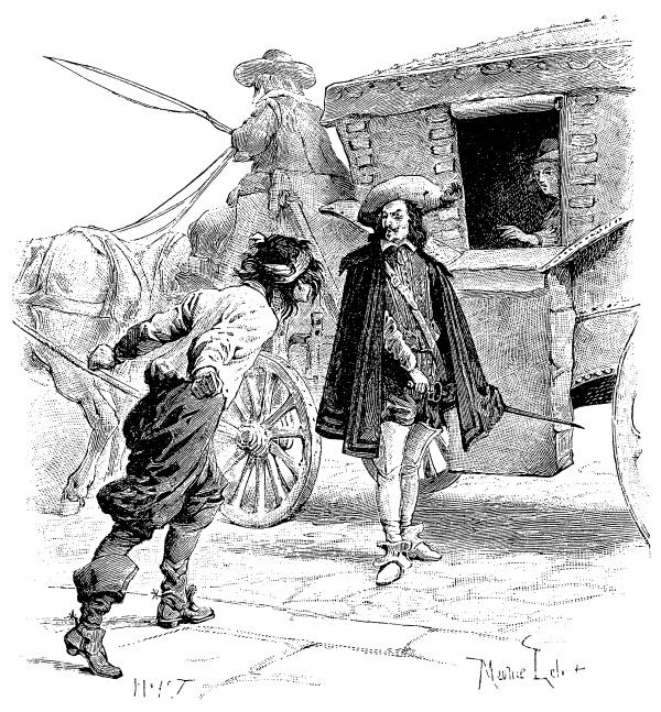 – Трус, подлец, самозваный дворянин! – вскричал д’Артаньян, бросаясь в свою очередь за слугою.