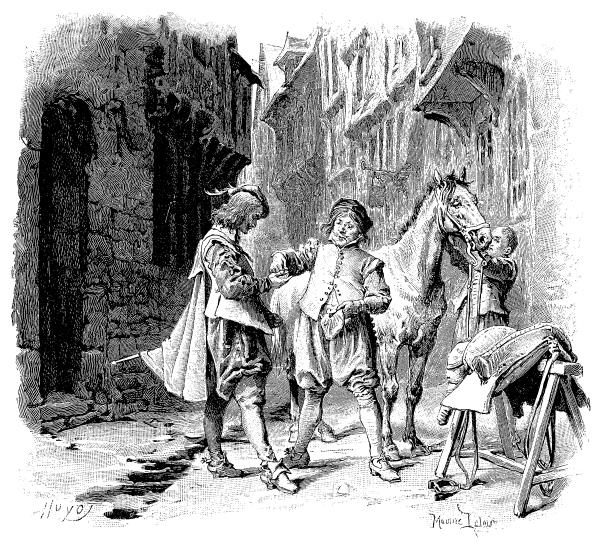 Потом д’Артаньян с важностью вынул из кармана два экю, протянул их хозяину, который с шапкой в руках проводил его до ворот. Тут д’Артаньян вскочил на своего рыжего коня, а конь без дальнейших приключений довёз его до ворот Сент-Антуан в Париже, где владелец и продал его за три экю, то есть весьма выгодно, потому что в последний переход д’Артаньян совсем его загнал. Барышник, которому он уступил коня, признался ему, что эту непомерную цену даёт только ввиду необыкновенной масти лошади.