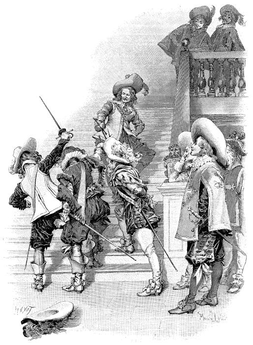 Мушкетёр, стоявший в эту минуту на верхней ступени, мастерски отражал атаки своих противников. Вокруг них собралась целая толпа. По условиям игры раненый выходил из игры при первой же царапине и уступал удачливому противнику свою очередь на аудиенции. В пять минут трое были задеты – один в руку, другой в подбородок, а третий в ухо, – причём сам защищающий ступень не был задет ни разу и, таким образом, по условиям, выигрывал три очереди.