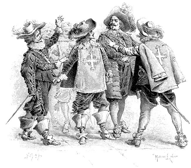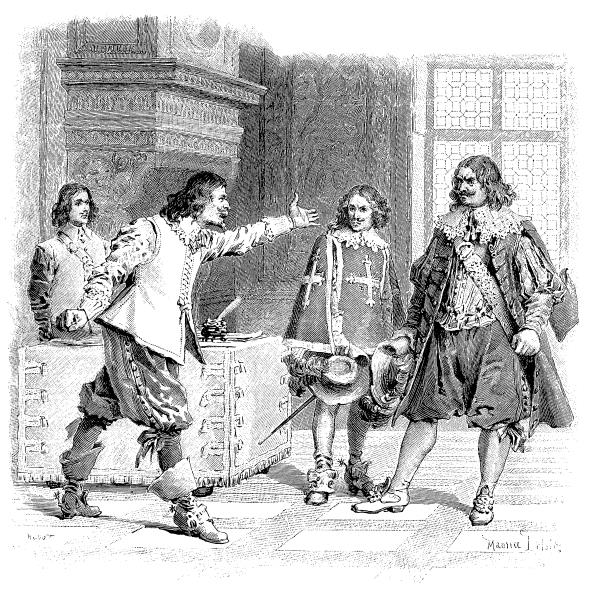 – Господин капитан, я прибыл в Париж точно с такими же намерениями; отец наказывал мне никому ни в чём не уступать, кроме короля, кардинала и вас, которых он считает тремя первыми людьми во Франции.