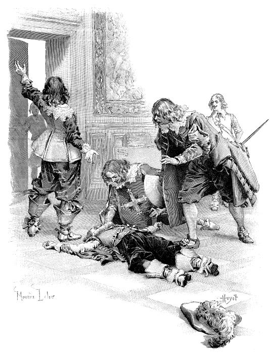 Дверь оставалась полуоткрытой – так сильно было впечатление, произведённое появлением Атоса, о ране которого, несмотря на окружавшую это происшествие тайну, было всем известно. Одобрительный гул покрыл последние слова капитана, и две или три головы в порыве радостного возбуждения показались из-за портьеры. Де Тревиль был готов обуздать нарушителей этикета, как вдруг почувствовал, что рука мушкетёра судорожно сжимается в его руке, и увидел, что Атос вот-вот лишится чувств. И в то же мгновение Атос, напрягавший все силы, чтобы противостоять боли, но побеждённый ею, замертво рухнул на пол.