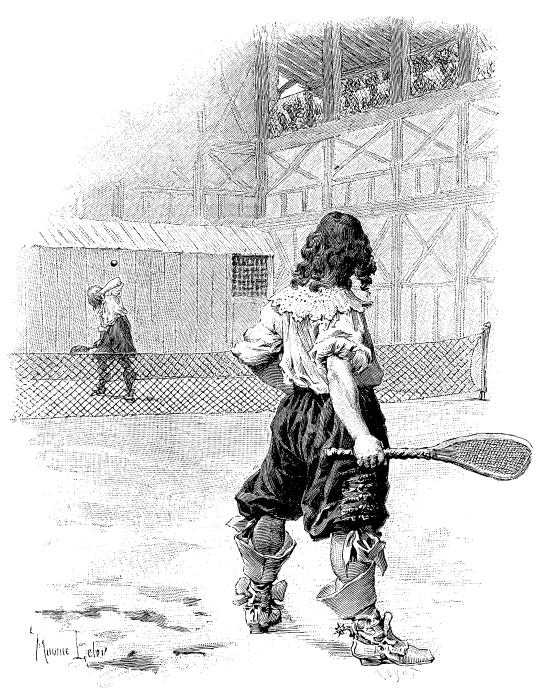 Портос и Арамис были уже на месте и играли между собою. Атос, весьма искусный во всех упражнениях, составил партию с д’Артаньяном и стал играть против них. Но при первом же движении, хоть он и играл левою рукою, он понял, что рана его недостаточно зажила для подобных упражнений. Д’Артаньян остался один и объявил, что он ещё слишком неопытен, чтобы играть по правилам, поэтому продолжали только кидать мячи, не считая очков. Но один из мячей, пущенных геркулесовской рукой Портоса, пролетел в такой опасной близости от лица д’Артаньяна, что тот подумал, что если бы мяч не пролетел мимо, а попал ему в лицо, аудиенция, вероятно, не могла бы состояться, ибо невозможно было бы в таком состоянии явиться к королю. А так как, по его гасконскому воображению, от этой аудиенции зависела вся его будущность, д’Артаньян учтиво поклонился Портосу и Арамису, сказав, что примется за игру только тогда, когда почувствует себя достаточно искусным, чтобы противостоять им. С этими словами он отошёл за верёвку и присоединился к зрителям.