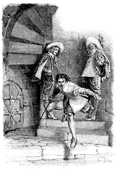 И он бросился вон из комнаты. На лестнице он столнулся с Атосом и Портосом, шедшими к нему. Они дали ему дорогу, и д’Артаньян пролетел между ними как стрела.