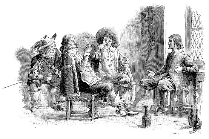 Пока д’Артаньян бегал по улицам и колотил в дверь, Арамис присоединился к своим товарищам, так что, вернувшись к себе, д’Артаньян нашёл всю компанию в сборе.