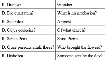 No sooner did the two magistrates join the others than the superior was seized with violent convulsions, writhing and uttering squeals in exact imitation of a sucking pig. The two magistrates looked on in profound astonishment, which was greatly increased when they saw the patient now bury herself in her bed, now spring right out of it, the whole performance being accompanied by such diabolical gestures and grimaces that, if they were not quite convinced that the possession was genuine, they were at least filled with admiration of the manner in which it was simulated. Mignon next informed the bailiff and the civil lieutenant, that although the superior had never learned Latin she would reply in that language to all the questions addressed to her, if such were their desire. The magistrates answered that as they were there in order to examine thoroughly into the facts of the case, they begged the exorcists to give them every possible proof that the possession was real. Upon this, Mignon approached the mother superior, and, having ordered everyone to be silent, placed two of his fingers in her mouth, and, having gone through the form of exorcism prescribed by the ritual, he asked the following questions word for word as they are given,