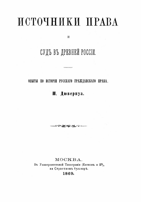 Предлагаемый вниманию читателя труд Н. Л. Дювернуа «Источники права и суд в Древней России. Опыты по истории русского гражданского права», изданный в Москве в 1896 г., представляет собой, как уже было сказано, магистерскую диссертацию ученого.