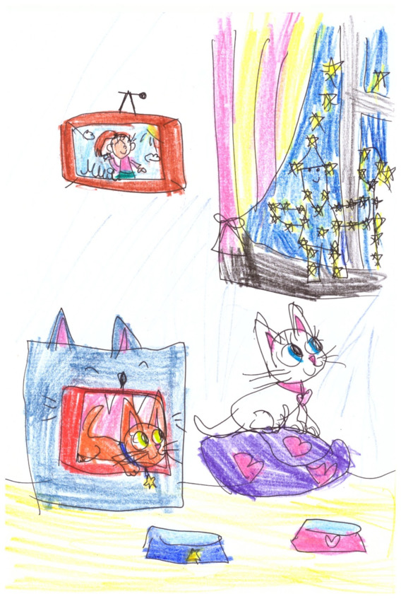 Когда мультик закончился, Мия сказала, что уже скоро Новый год. Мия нарисовала деда Мороза и убежала гулять. Котята сидели дома. Мия их не пустила гулять, потому что их потом надо мыть, а они не хотят.