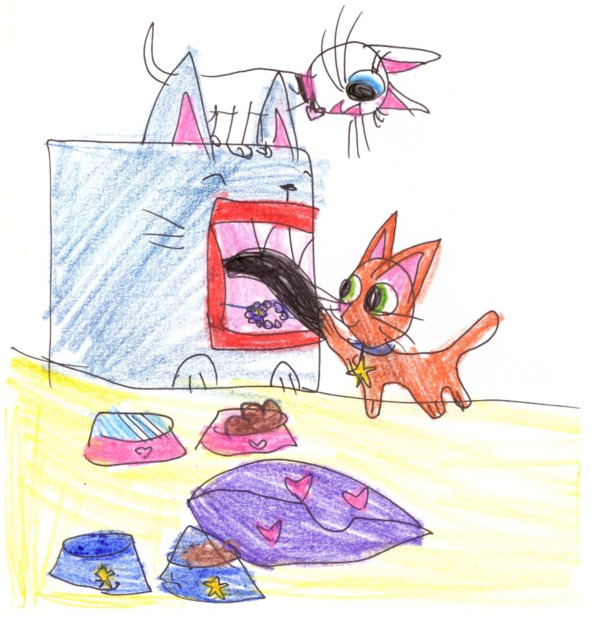 Вечером, когда Мия пришла со школы, она рассказала котятам, что Мина сказала ей, что когда она зашла домой, то увидела такую картину. Мама сердилась… Да и Мурзик был недоволен. Но не так сильно, как она думала. Щен погрыз обувь, наделал дел на кровати, стащил еду из холодильника, но она говорит, что папа не против, ему понравился Щен. Но маме это надоело…
